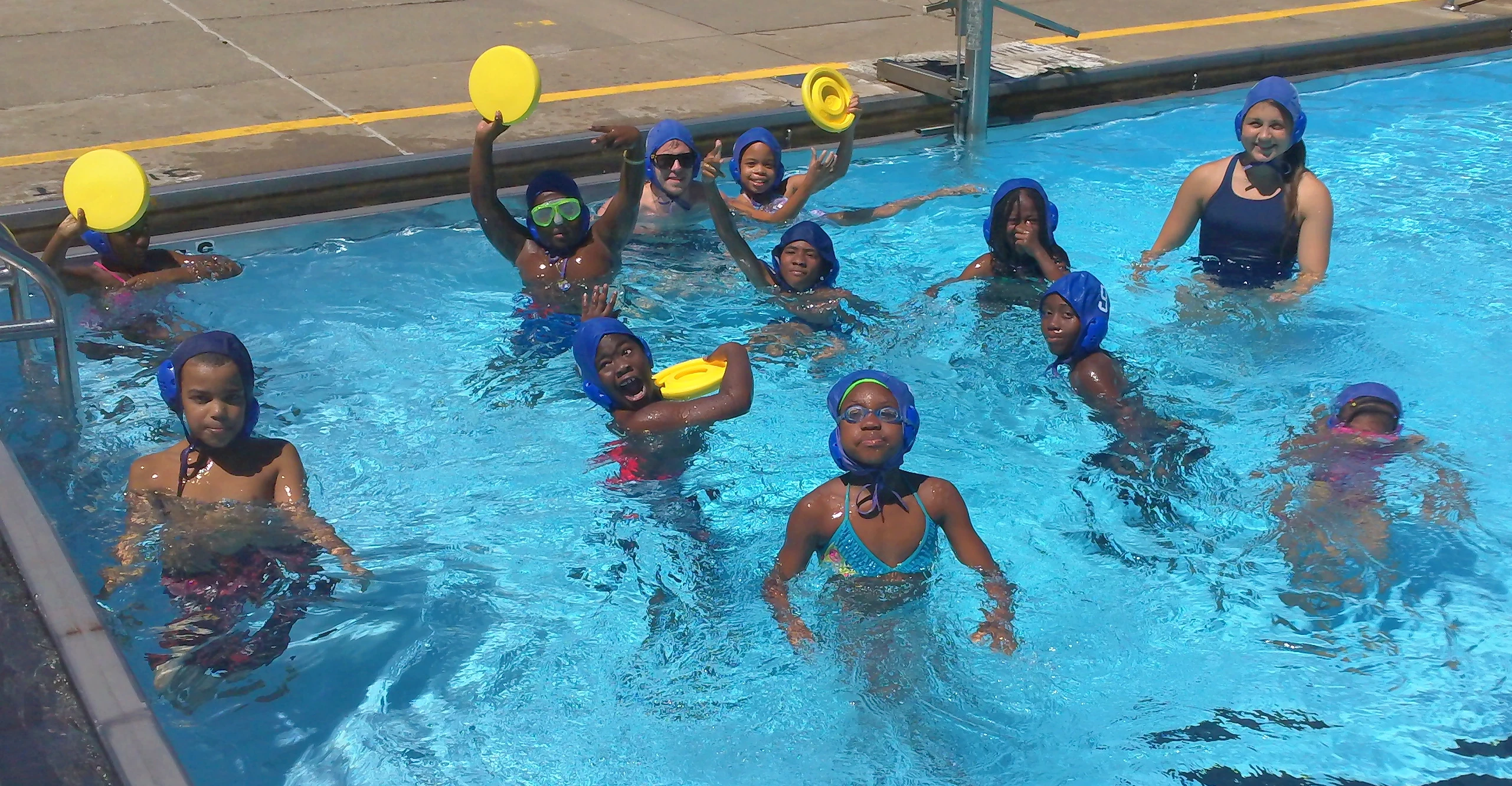 Squad sends a salute to signal some serious summer fun at Highland Park Pool. The yellow foam swim disks, aquatic frisbees, were part of the game-play.