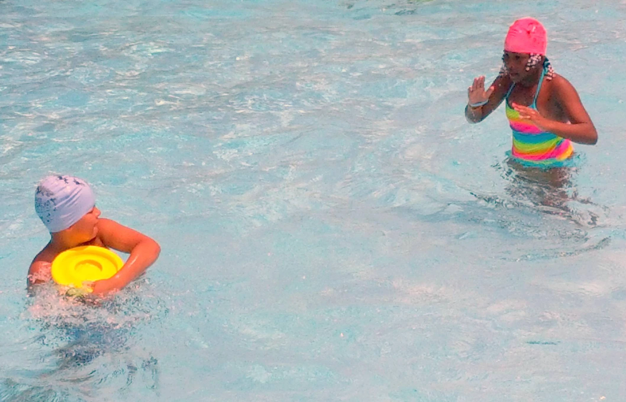Engagement with SKWIM includes: introduction with casual game-play among drop-in individuals and invited community groups (church, scouts, nonprofit, professional, neighborhood, school, teams). Mix audiences, ages 10-and-older to adults, participate in a new, non-contact sport. Playing well with others happens in a setting that stresses teamwork, sportsmanship and integrity with pick-up/playground style squads. The ad-hoc teams form with a coordinator. These highly-social games occur in a lagoon area within the pool. SKWIM is sorta like water polo, but far easier to do and understand. First-time participants are proficient and make team contributions. SKWIM is played with a soft, foam, disk that easily skims along the water's surface. Players pass and shot the disk into goals (like hockey, soccer, lacrosse and basketball) but teamwork matters, sorta like Ultimate Frisbee. Optional fins and life vests are provided.